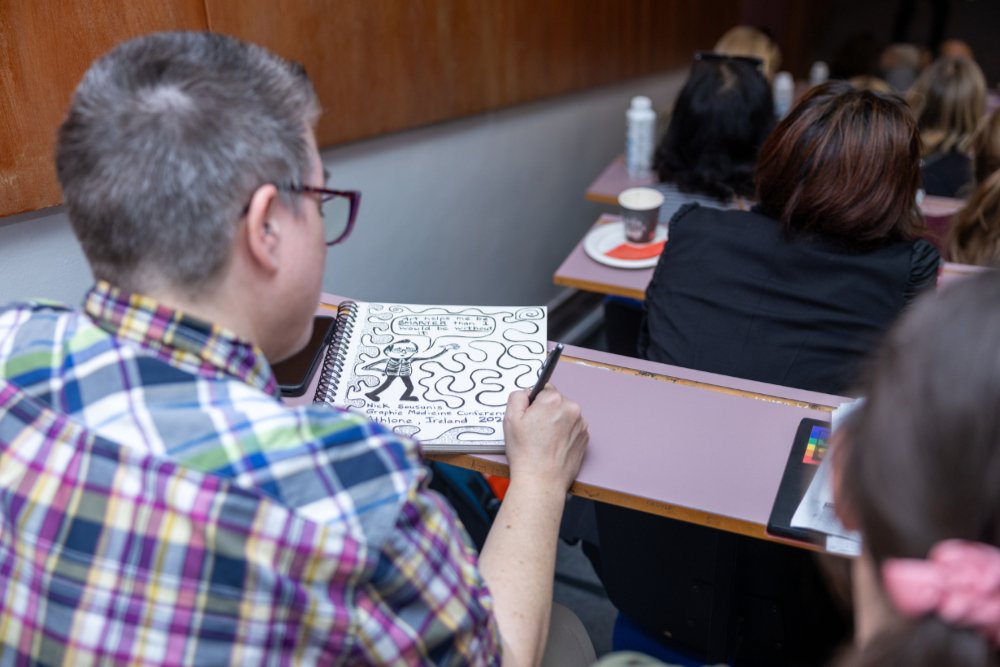 Attendee taking part in Graphic Medicine workshop. Image of the Graphic Medicine International Collective Conference 2024, taken by Nathan Cafolla and Jeff Harvey, courtesy of Technological University of the Shannon (TUS).