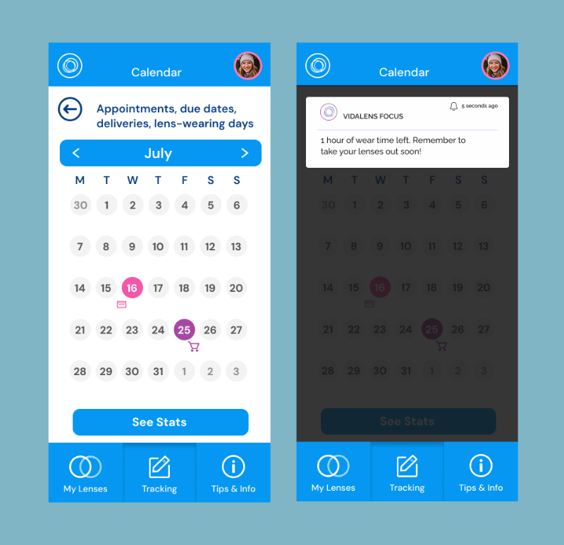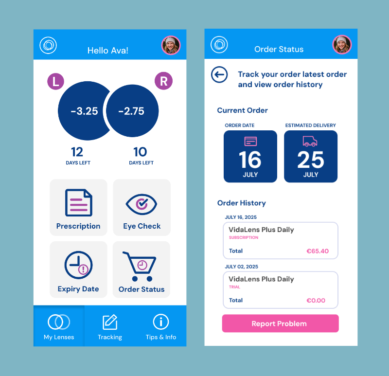 We designed a UI/UX app prototype, VidaLens Focus, a seamless digital companion for contact lens wearers. Serving as a hub for managing lens usage, placing orders, tracking wear time, and accessing support, it is built with clarity, empathy, and accessibility in mind and reflects our vision for user-centred HealthTech design.